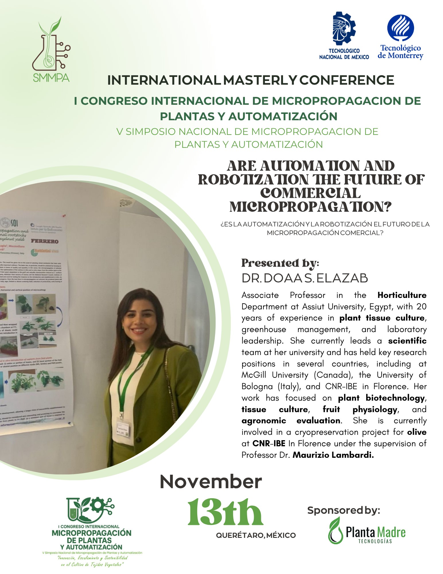 | PI Congreso Internacional de Micropropagación de Plantas y Automatización: V Simposio Nacional de Micropropagación de Plantas y Automatización | 13 y 14 de noviembre | Tecnológico de Monterrey Campus Querétaro |